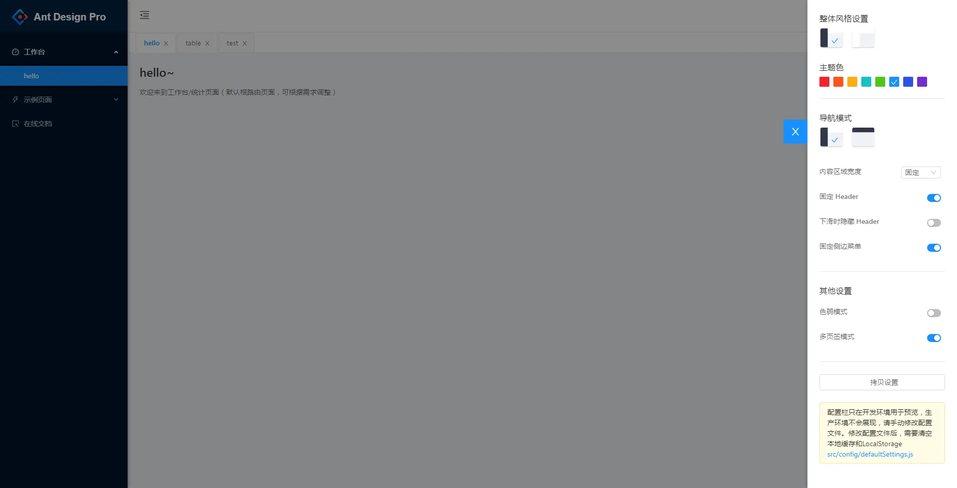 可不可以快速地、可视化地去配置项目的整体风格呢?答案是肯定的,ANTD PRO VUE 提供了一个可快速设置项目整体UI风格的 SettingDrawer,可以快速设置主题色,导航模式,多标签模式等。设置后会以本地缓存的模式记录配置,下次加载页面的时候会判断是否有缓存并持续生效。