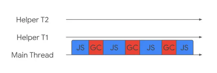 描述:并行是主线程和协助线程同时执行同样的工作,但是这仍然是一种 ‘stop-the-world’ 的垃圾回收方式,但是垃圾回收所耗费的时间等于总时间除以参与的线程数量(加上一些同步开销)。因为没有 JavaScript 的执行,因此只要确保同时只有一个协助线程在访问对象就好了。