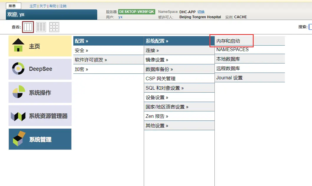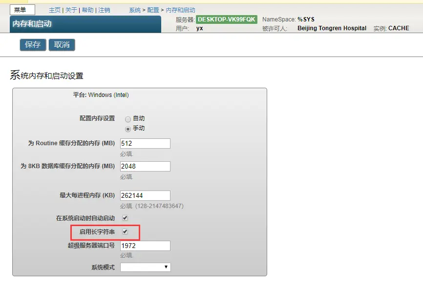 - 在管理门户中(Management Portal),选择[Home] > [Configuration] > [Memory and Startup].在“系统内存和启动设置 System Memory and Startup Settings ”页上,选中“启用长字符串 Enable Long Strings”复选框。