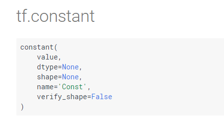 constant中有几个属性,value就是constant的数值,我们可以给他赋值,比方说0维的scalar,1维的Vector,2维的matrix或者是3维的张量。dtype、shape、name刚都有写过,verify_shape是布尔值,用于验证值的形状。除了value外都不一定要指定,可以有默认的值但是必须要有一个value。