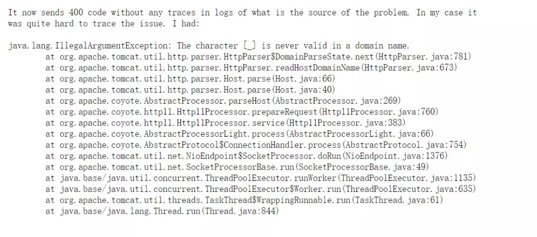 虽然看上去跟我们的问题是一样的,都是400问题,但是具体发生的原因是不一样的。这个issue是说,如果domain name .ext 包含数字,比如 "domain.sf1m",会出现400问题。这个问题也已经在tomcat的新版本中修复了。