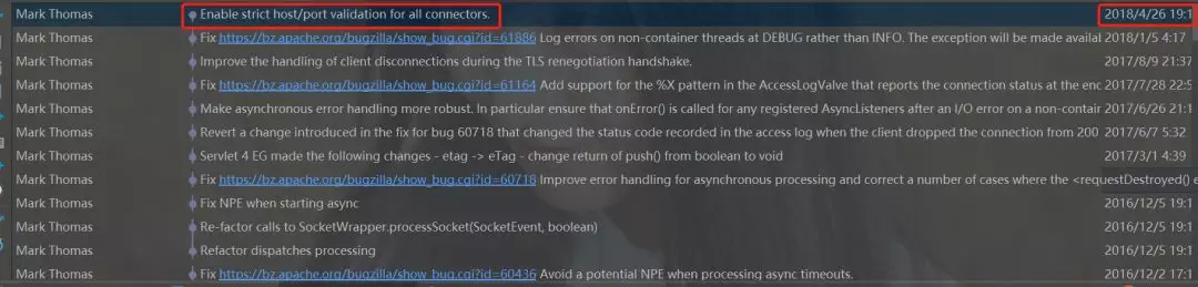 由于之前没有看过tomcat的源代码,所以要分析出到底是哪一行代码有问题是很困难的,所以我查看了下tomcat的相关的bugImprove logging in AbstractProcessor.parseHost()