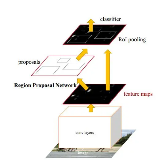 Faster-Rcnn原理简介鉴于之上的分析,想要在时间上有所突破就要在如何更快的产生proposal上做工夫。 Faster使用NN来做region proposal,在Fast-rcnn的基础上使用共享卷积层的方式。作者提出,卷积后的特征图同样也是可以用来生成 region proposals 的。通过增加两个卷积层来实现Region Proposal Networks (RPNs) , 一个用来将每个特征图 的位置编码成一个向量,另一个则是对每一个位置输出一个 objectness score 和 regressed bounds for k region proposals. RPN(1) 输出proposal的位置(坐标)和score (2) 将不同scale和ratio的proposal映射为低维的feature vector (3) 输出是否是前景的classification和进行位置的regression