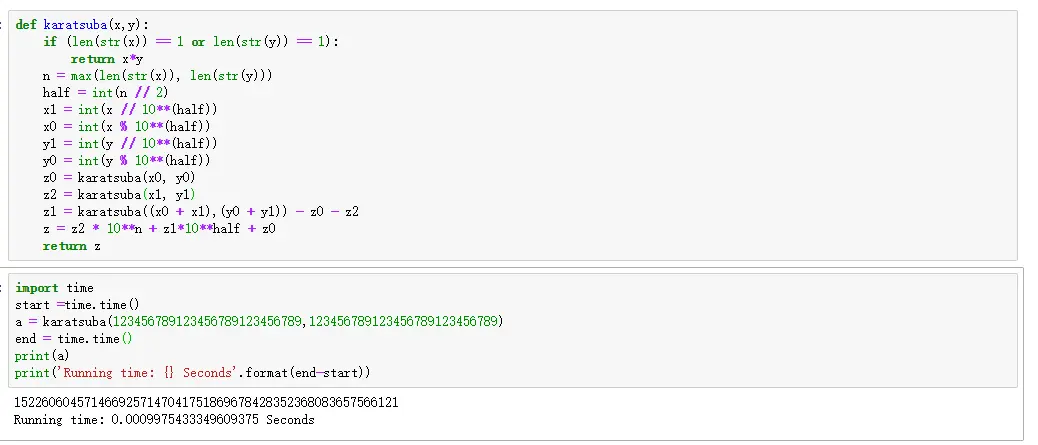karatsuba算法原理及python实现 大石头的笔记 2020-05-07 1,116 阅读1分钟 karatsuba algorithm 计算大数乘法:暴力解法是:其中都将x,y分成一半,x1是高位,x0是低位,对y也是这样,r是进制的权重,十进制就是10。可知需要四次的乘法操作,复杂度将为Θ(N)让:最后的式子z = 的右边实际上变成了三项,我们总共做三次的乘法,因此有等式Θ(N)是加法的操作时间,3次乘法因此有3T(n/2),最后计算出来的时间是θ( nlog23) = θ( n 1.5849625··)比上面的暴力解法要好。如果分成3份或者更多可能效果更好,例如分成3份最终运行时间是θ( nlog35)更加好。python代码测试:可以清楚看出时间的差距。更多免费技术资料可关注:annalin1203