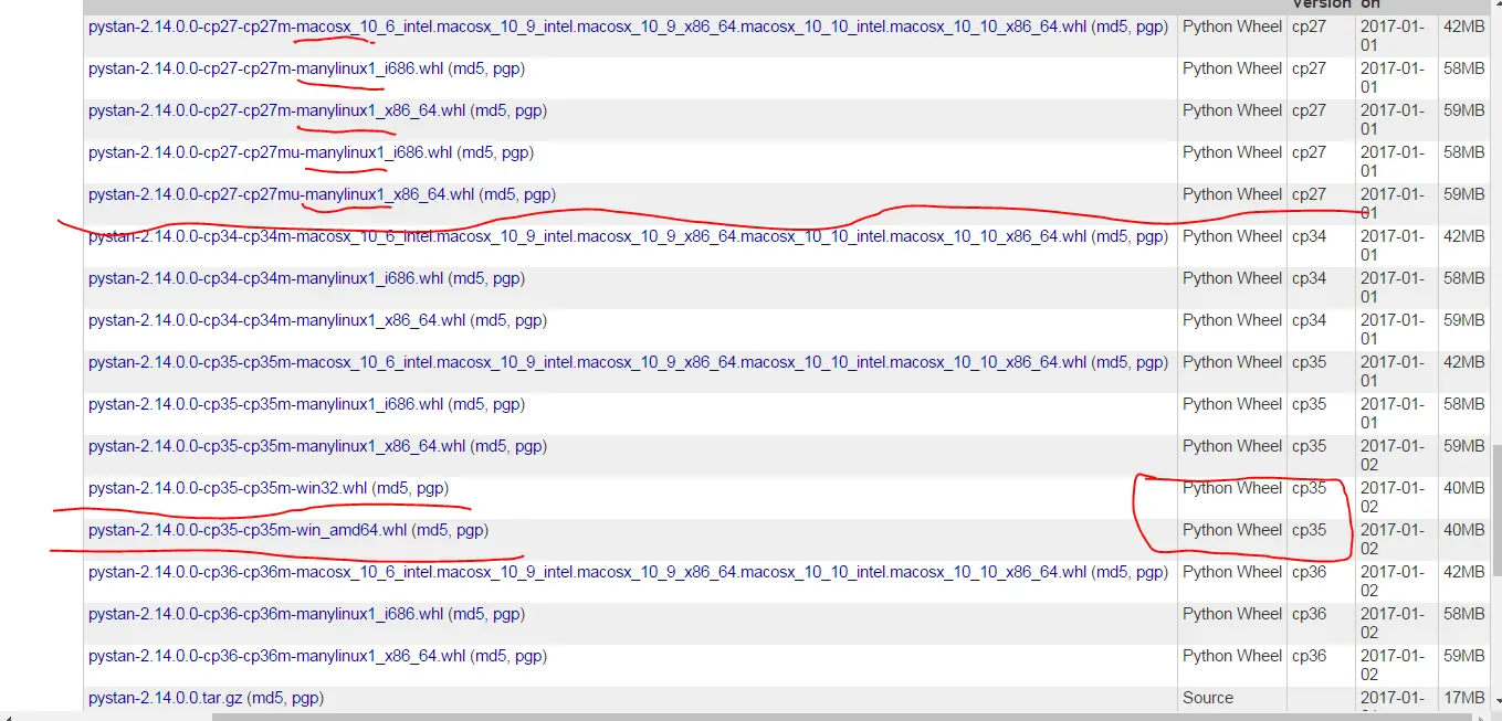 本人是win7-32位系统,原本使用的是Python2.7的Anaconda。在pip安装PyStan时,一直不成功。我怀疑是我的python版本问题,于是上PyStan的网站上查询,发现