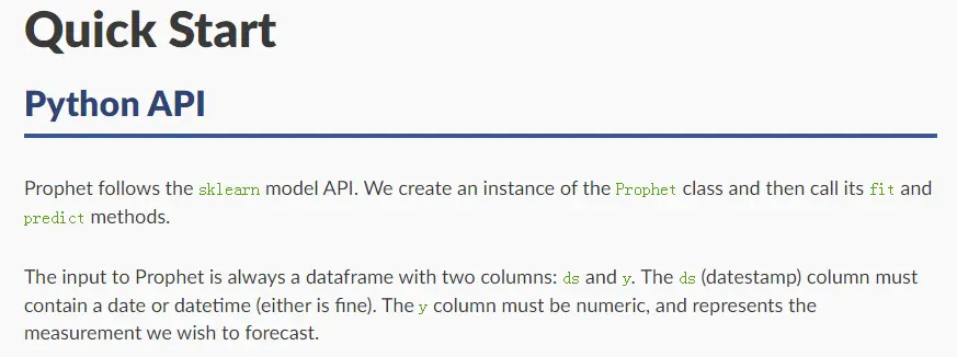 Prophet遵循了sklearn的API,实例化模型后,用fit和predict方法实现,太感人了T-T。要求输入的dataframe两列,时间戳ds和变量y,初看给人感觉还是非常友好的。