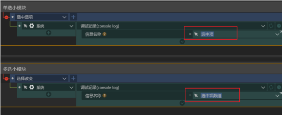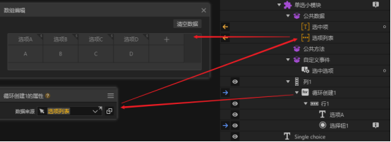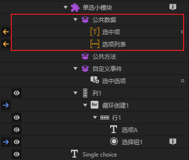 为了能够将选项列表传给小模块和从小模块中获取选择结果,这两者都需要放在公共数据之中。另外单项选择器中选择结果可以用一个文本变量或者数值变量存储,而多项选择器中我们需要用一个数组保存所有的已选选项。这样我们就可以将数据库中或小模块外数组中的选项赋值给小模块,通过获取小模块的公共数据属性得知选择结果(本案例中是使用了另一种方式获取选择结果)。