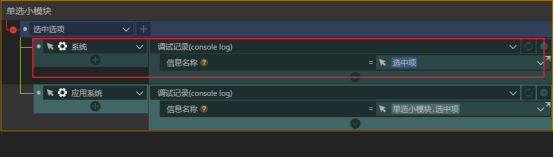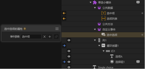 在小模块选择选项后我们一般会需要其它组件执行一些动作,所以需要给小模块添加一个自定义事件,并且我们将选择结果就作为事件的参数。这样小模块触发自定义事件时就可以在事件下添加其它组件的动作,而且也可以直接选择事件的参数。