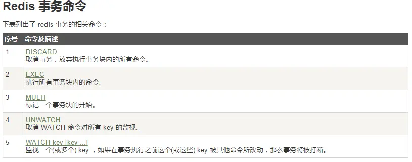 Watch指令,类似乐观锁,事务提交时,如果Key的值已被别的客户端改变,比如某个list已被别的客户端push/pop过了,整个事务队列都不会被执行。通过WATCH命令在事务执行之前监控了多个Keys,倘若在WATCH之后有任何Key的值发生了变化,EXEC命令执行的事务都将被放弃,同时返回Nullmulti-bulk应答以通知调用者事务执行失败