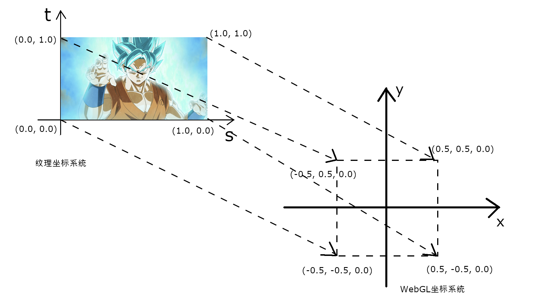 如图,在纹理坐标系中,纹理图像的左下角为(0.0, 0.0),右上角为(1.0, 1.0)。不要与WebGL的坐标系统搞混哦!