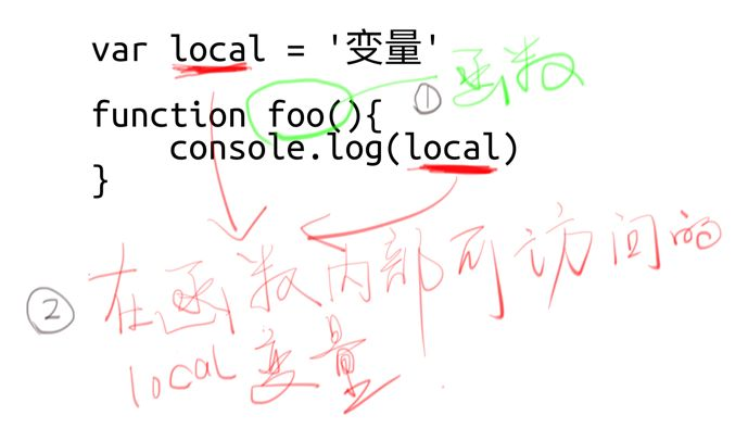 三行代码中,有一个局部变量 local,有一个函数 foo,foo 里面可以访问到 local 变量。
