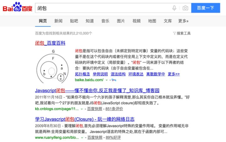 五年前,我也被这个问题困扰,于是去搜了 stackoverflow 并总结下来。你在百度搜闭包,那篇《JavaScript闭包——懂不懂由你,反正我是懂了》就是我写的。当时我还是新手,一直不理解为什么大家口中的闭包这么模糊、这么琢磨不定呢。