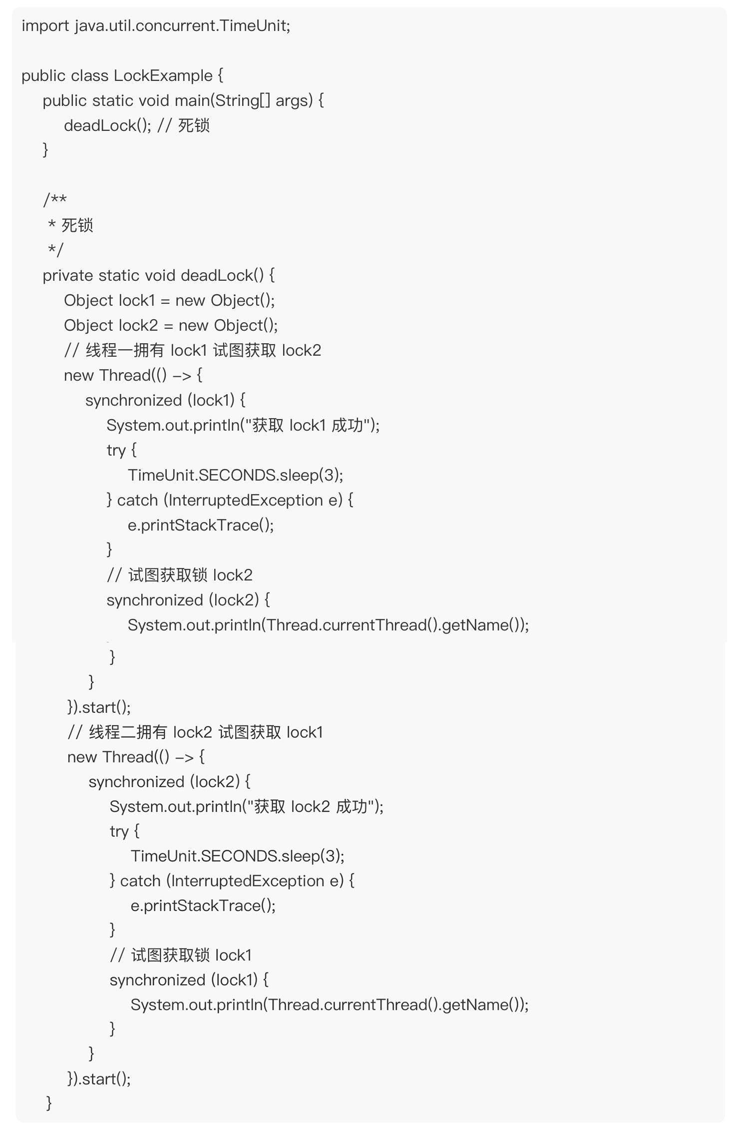 可以看出当我们使用线程一拥有锁 lock1 的同时试图获取 lock2,而线程二在拥有 lock2 的同时试图获取 lock1,这样就会造成彼此都在等待对方释放资源,于是就形成了死锁。