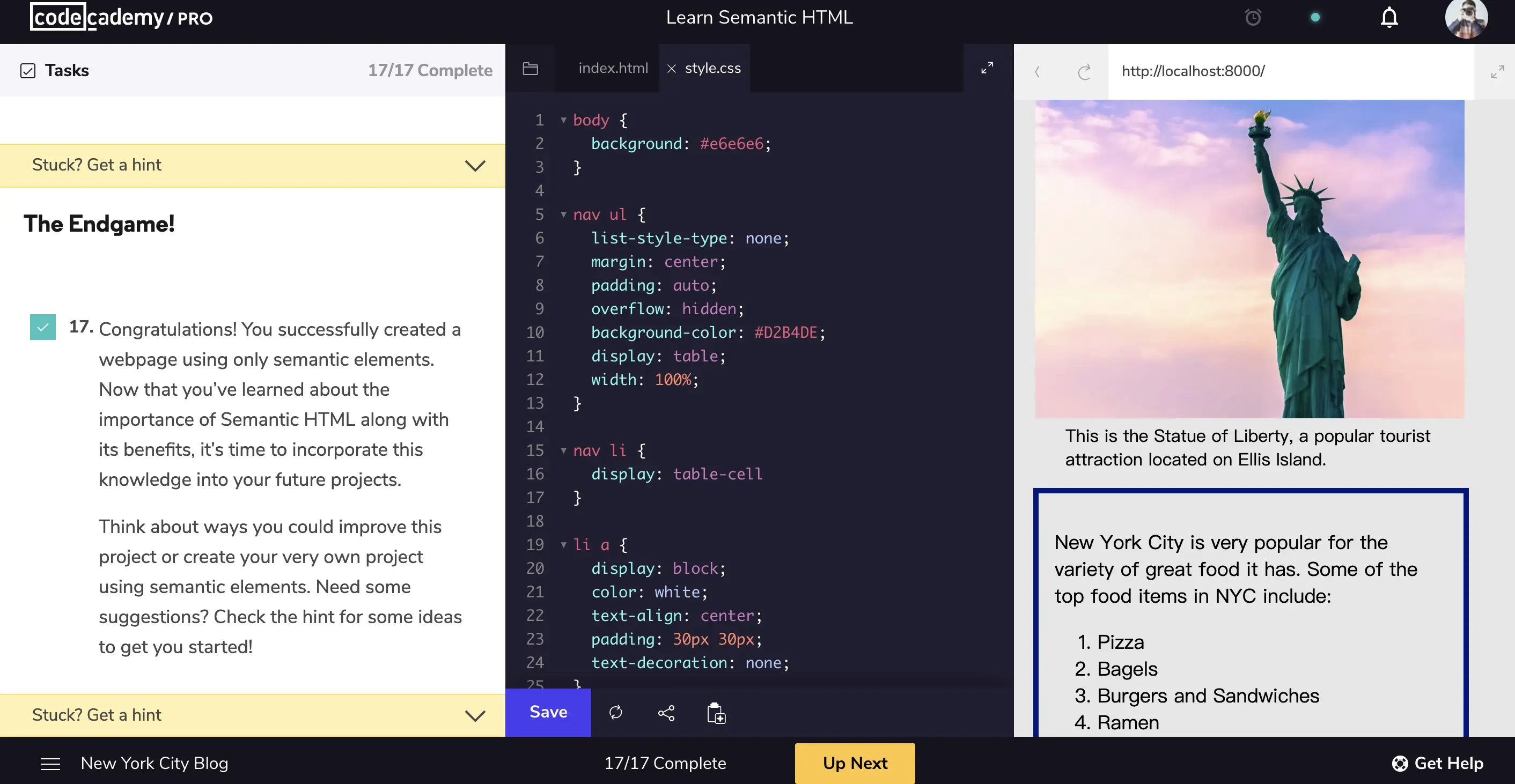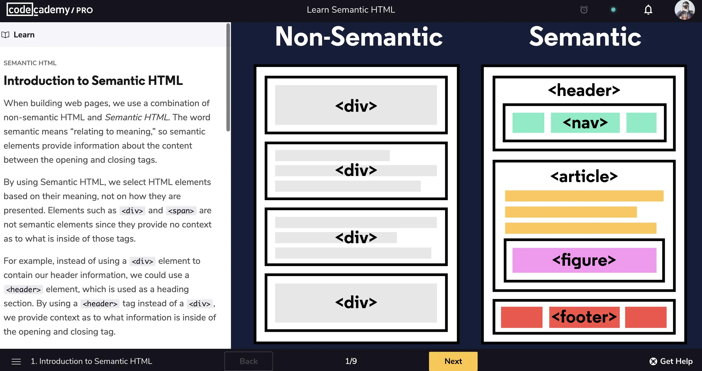 Semantic HTML introduces meaning to a page through specific elements that provide context as to what is in between the tags. Semantic HTML is a modern standard and makes a website accessible for people who use screen readers to translate the webpage and improves your website’s SEO.