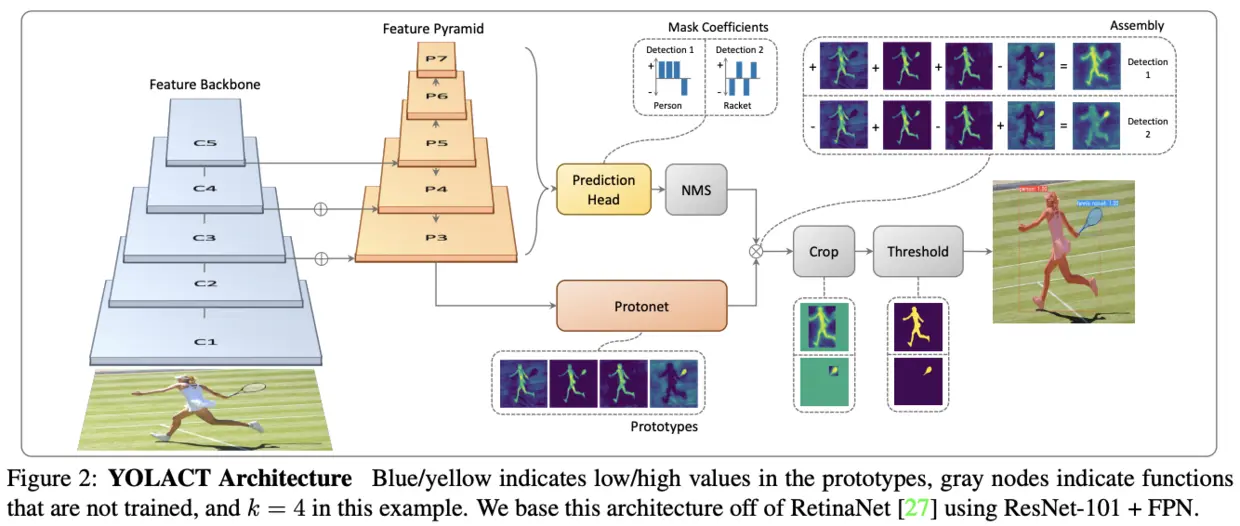 YOLACT的主要想法是直接在one-stage目标检测算法中加入Mask分支,而不添加任何的RoI池化的操作,将实例分割分成两个并行的分支: