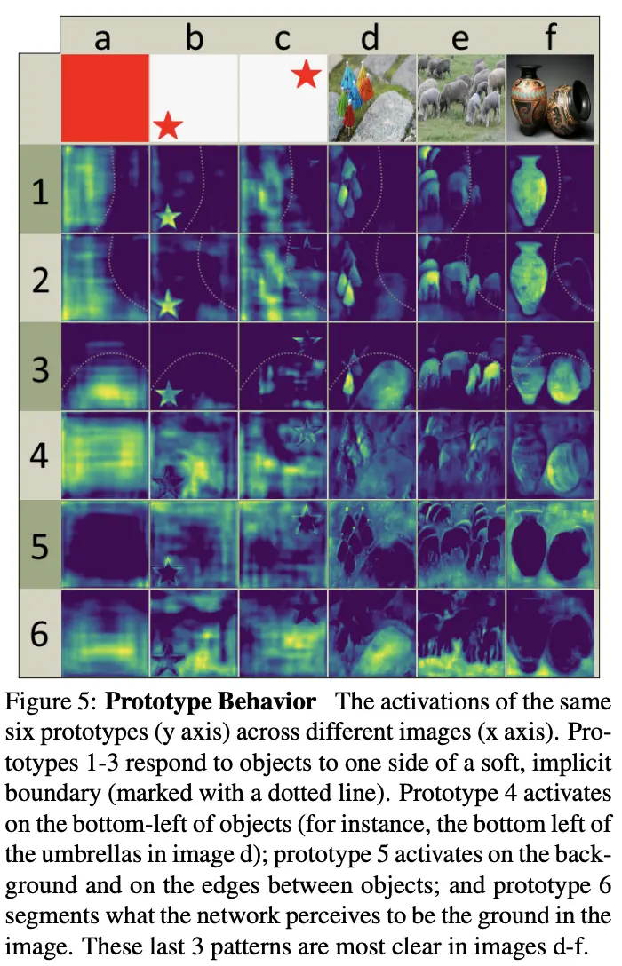 一般而言,FCN做分割都需要添加一些额外的trick来增加平移可变性,比如position-sensitive特征图,虽然YOLACT唯一增加平移可变形的措施是对最终的mask进行截取输出,但是论文发现对于中大物体不截取输出的效果也不错,这代表YOLACT的原型mask学到了对不同的实例进行不同的响应,如图5所示,适当地对原型mask进行组合就能得出实例。需要注意的是全红的输入图片,其原型mask特征是各不一样的,这是由于每次卷积都会padding,使得边界存在可区分性,所以主干网络本身就存在一定的平移可变形。