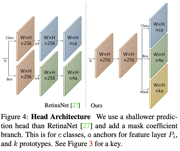 在经典的anchor-based目标检测算法中,检测head一般有两个分支,分别预测类别和bbox偏移。在此基础上添加第三个用于mask因子预测的分支,每个实例预测个mask因子。
