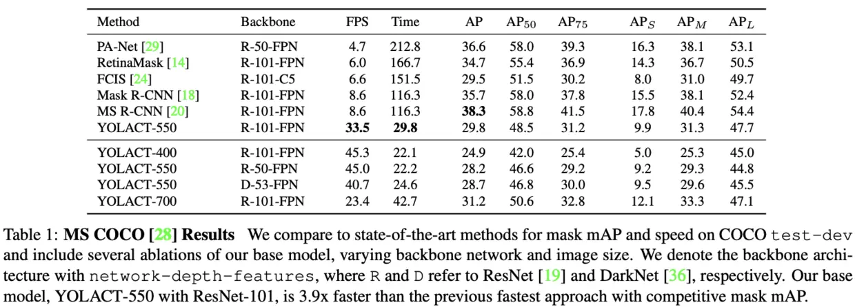 目前的实例分割方法虽然效果都有很大的提升,但是均缺乏实时性,为此论文的提出了首个实时()实例分割算法YOLACT,论文的主要贡献如下: