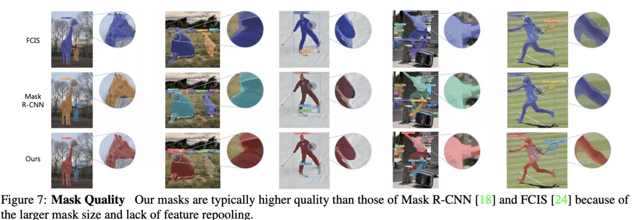 这样做的原理在于,mask在空间上是连续的,卷积能很好地保持这种特性,因此原型mask通过全卷积生成的,而全连接层虽然不能保持空间连贯性,但能很好地预测语义向量,于是用来生成instance-wise的mask因子向量,结合两者进行预测,既能保持空间连贯性,也能加入语义信息并保持one-stage的快速性。最后取目标检测分支经过NMS后的实例,逐个将原型mask和mask因子向量相乘,再将相乘后的结果合并输出