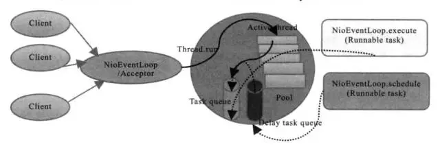 当然线程模型是一种更高级别的并发编程内容,它是一种编程指导思想,尤其在我们进行底层框架设计的时候特别需要注意线程模型,因为一旦线程模型设计不合理,可能会导致后面框架代码过于复杂,并且可能因为线程同步等问题造成问题不可控,最终导致系统运行失控。类似于Netty的线程模型是一种好的线程模型,下面展示了这种模型: