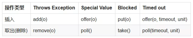 这些队列的区别就在于从队列中存取数据时的具体表现,比如对于延时队列来说,获取数据的线程可能被阻塞等待一段时间,也可能立刻返回,对于优先级阻塞队列,获取的数据是根据一定的优先级取到的。下面展示了一些队列操作的具体表现: