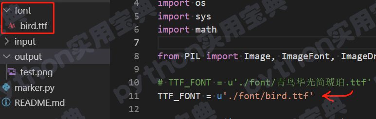 还有一个隐藏功能!如果你想要修改字体也可以哦!还记得我们前面怎么修复windows的中文名问题吗?如图,你只要将新的字体文件放到font文件夹下,然后修改TTF_FONT变量里的字体名字,与font文件夹下的新字体名字相对应即可改成你想要的字体了!