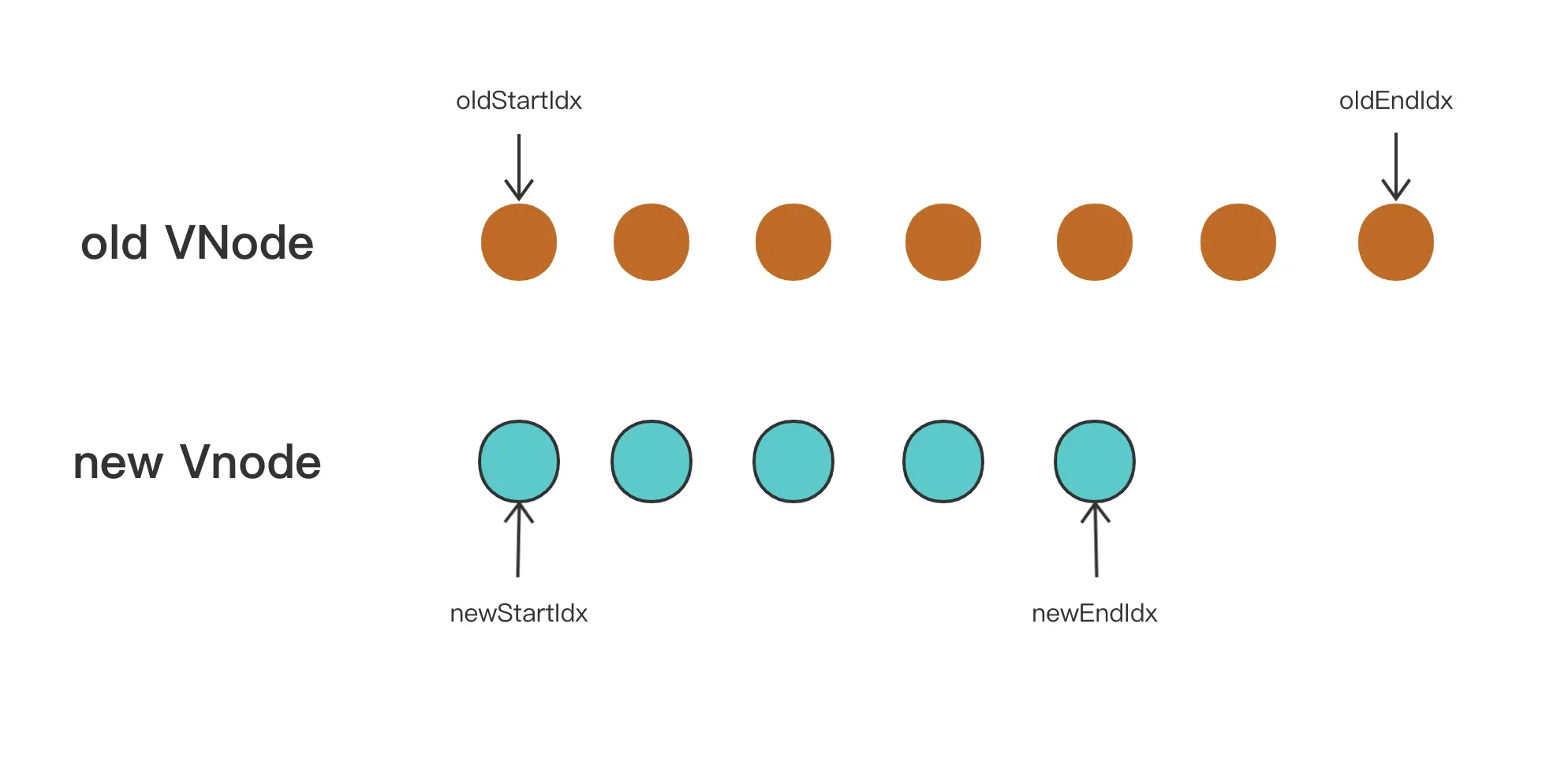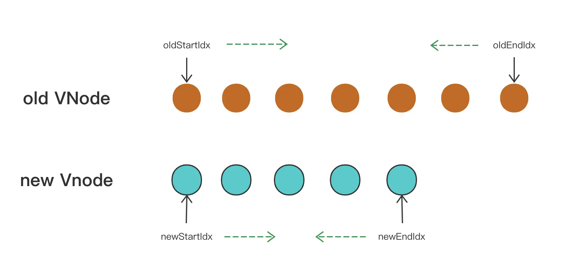 首先定义了 oldStartIdx、newStartIdx、oldEndIdx 以及 newEndIdx 分别是新老两个 VNode 的开始/结束的下标,同时 oldStartVnode、newStartVnode、oldEndVnode 以及 newEndVnode 分别指向这几个索引对应的 VNode 节点。