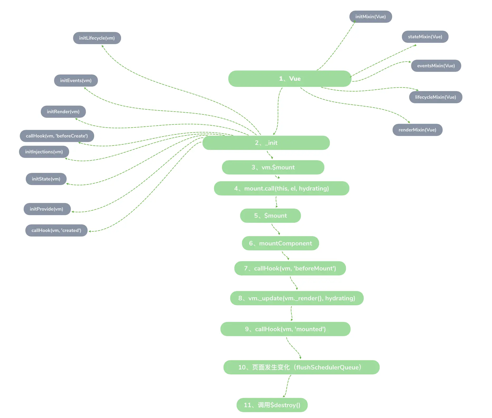 mountComponent内首先调用了beforeMount方法,然后在初次渲染和更新后会执行vm._update(vm._render(), hydrating)方法。最后渲染完成后调用mounted钩子。beforeUpdate和updated钩子是在页面发生变化,触发更新后,被调用的,对应是在src/core/observer/scheduler.js的flushSchedulerQueue函数中。beforeDestroy和destroyed都在执行$destroy函数时被调用。$destroy函数是定义在Vue.prototype上的一个方法,对应在src/core/instance/lifecycle.js文件中: