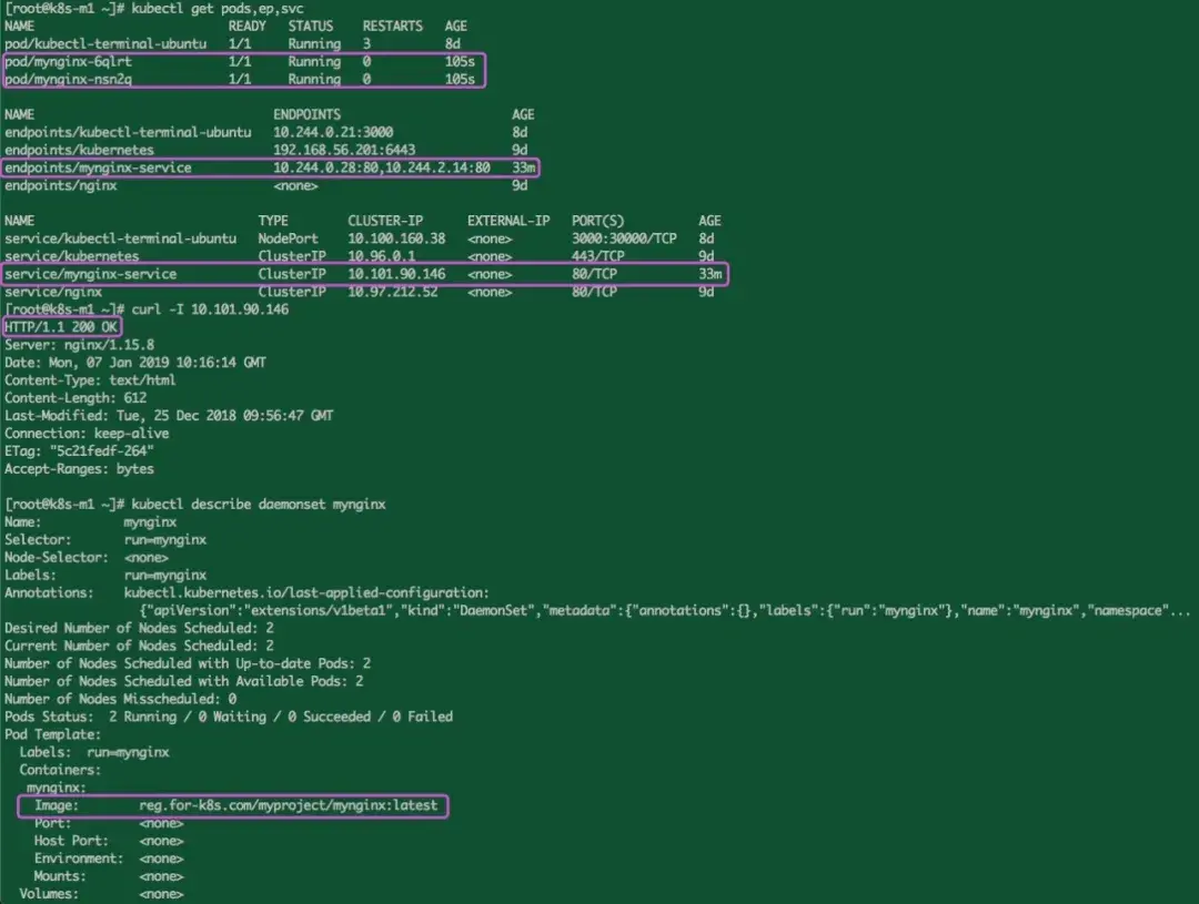 那为了测试pull并且能成功运行,我这里通过kuernetes运行一个DaemonSet,镜像采用: mynginx ,并且设置镜像pull策略为Always, 然后创建一个服务在集群内部通过ClusterIP能够访问, yaml如下: