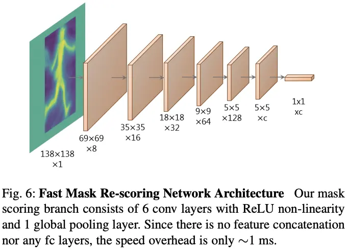 参考Mask Scoring R-CNN,为了缩小分类预测和mask质量间的差距,加入re-scoring分支预测mask与GT间的IoU。以YOLACT截取的mask预测结果(二值化前)为输入,使用6层带ReLU激活的卷积层提取特征,最后进行全局池化输出预测的IoU,将预测的IoU和分类分数相乘作为最终的分数。与Mask Scoring R-CNN的不同点在于: