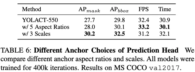 YOLACT是anchor-based检测算法,选择合适的anchor十分重要,论文尝试了两种选择:
