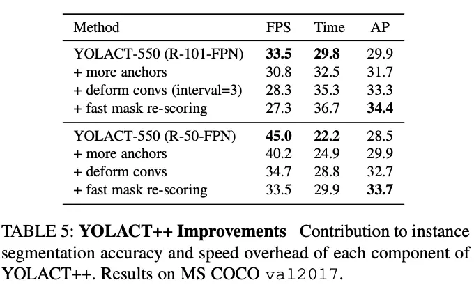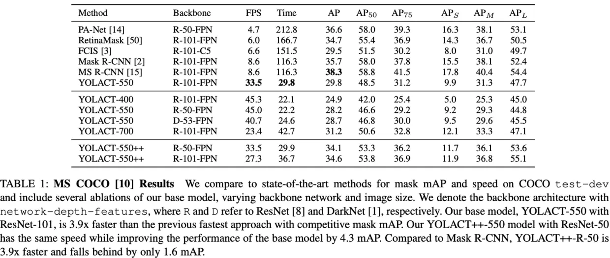 - YOLACT++没有使用全连接层,这是速度保持的关键,仅增加1.2ms的计算耗时,而Mask Scoring R-CNN的模块需要28ms。