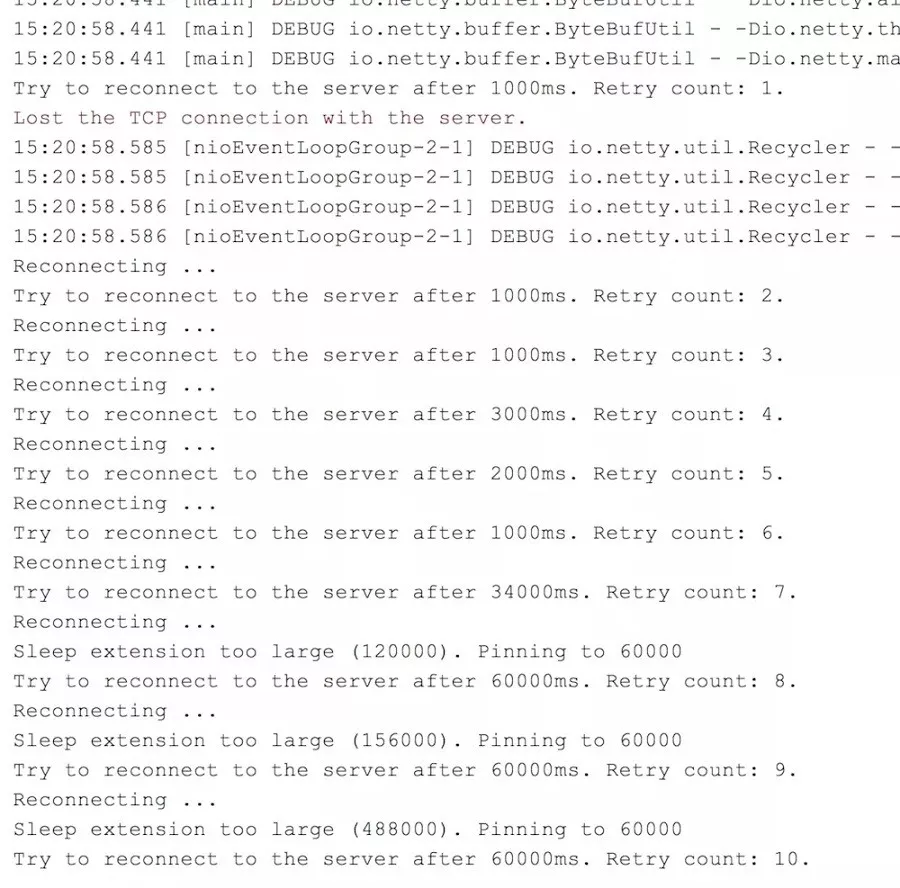 可以看到,当客户端发现无法连接到服务器端,所以一直尝试重连。随着重试次数增加,重试时间间隔越大,但又不想无限增大下去,所以需要定一个阈值,比如60s。如上图所示,当下一次重试时间超过60s时,会打印Sleep extension too large(*). Pinning to 60000,单位为ms。出现这句话的意思是,计算出来的时间超过阈值(60s),所以把真正睡眠的时间重置为阈值(60s)。