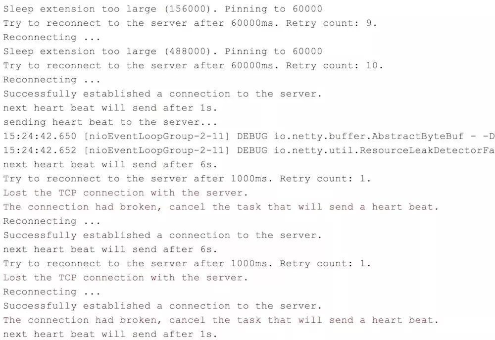可以看到,在第9次重试失败后,第10次重试之前,启动的服务器,所以第10次重连的结果为Successfully established a connection to the server.,即成功连接到服务器。接下来因为还是不定时ping服务器,所以出现断线重连、断线重连的循环。