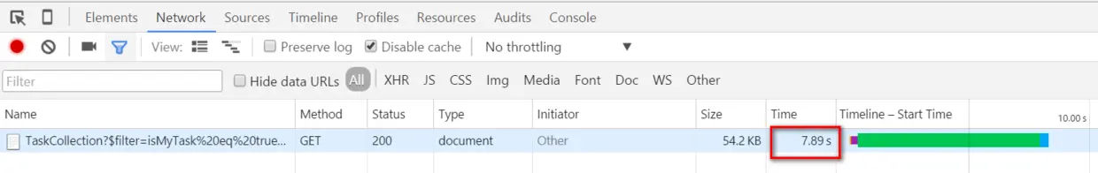 The OData service url being tested is: /sap/opu/odata/sap/CRM_ODATA/TaskCollection?expand=DocumentNotes,DocumentNextUserStatuses,DocumentHistories,DocumentApplicationLogs,Attachments