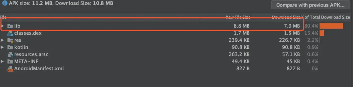 看到没,apk大小从2.1MB猛增加到11.2MB,多了一个原生so库的文件夹,大小为8.8MB,我们来看一下它的详细信息: