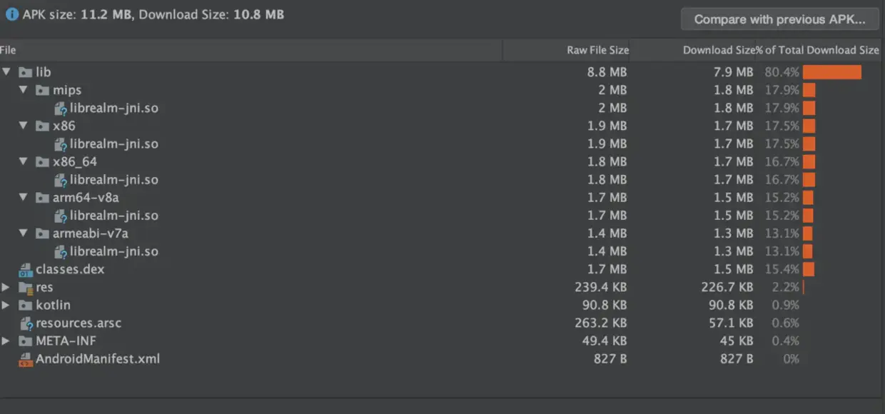 如上图所示,Realm为5种CPU架构生成了.so库,分别是mips、x86、x86_64、arm64-v8a、armeabi-v7a。增加了8.8MB包的大小。但是这不是我们想要的,我们只想要适配我们指定的的CPU架构,因此,我们需要在gralde.build中添加abifilters配置来完成我们想要的效果: