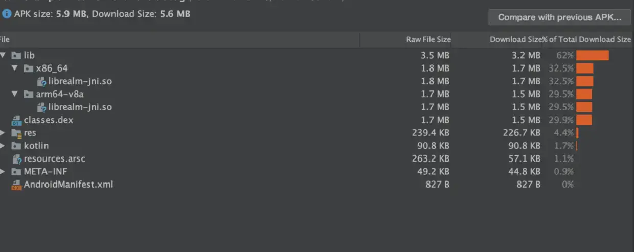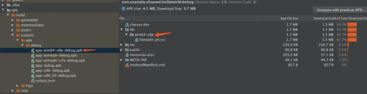 可以看到,只生成了我们指定CPU架构的so文件,包的大小也减少了5.3MB。