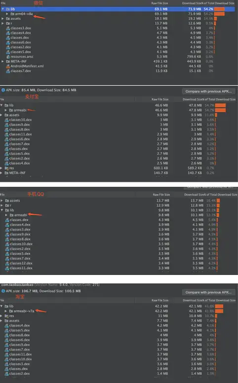 首先,我们下载一些大厂的APK,看一下他们的适配情况,这里我分析了微信、手机QQ、支付宝和淘宝这4个APP的适配情况: