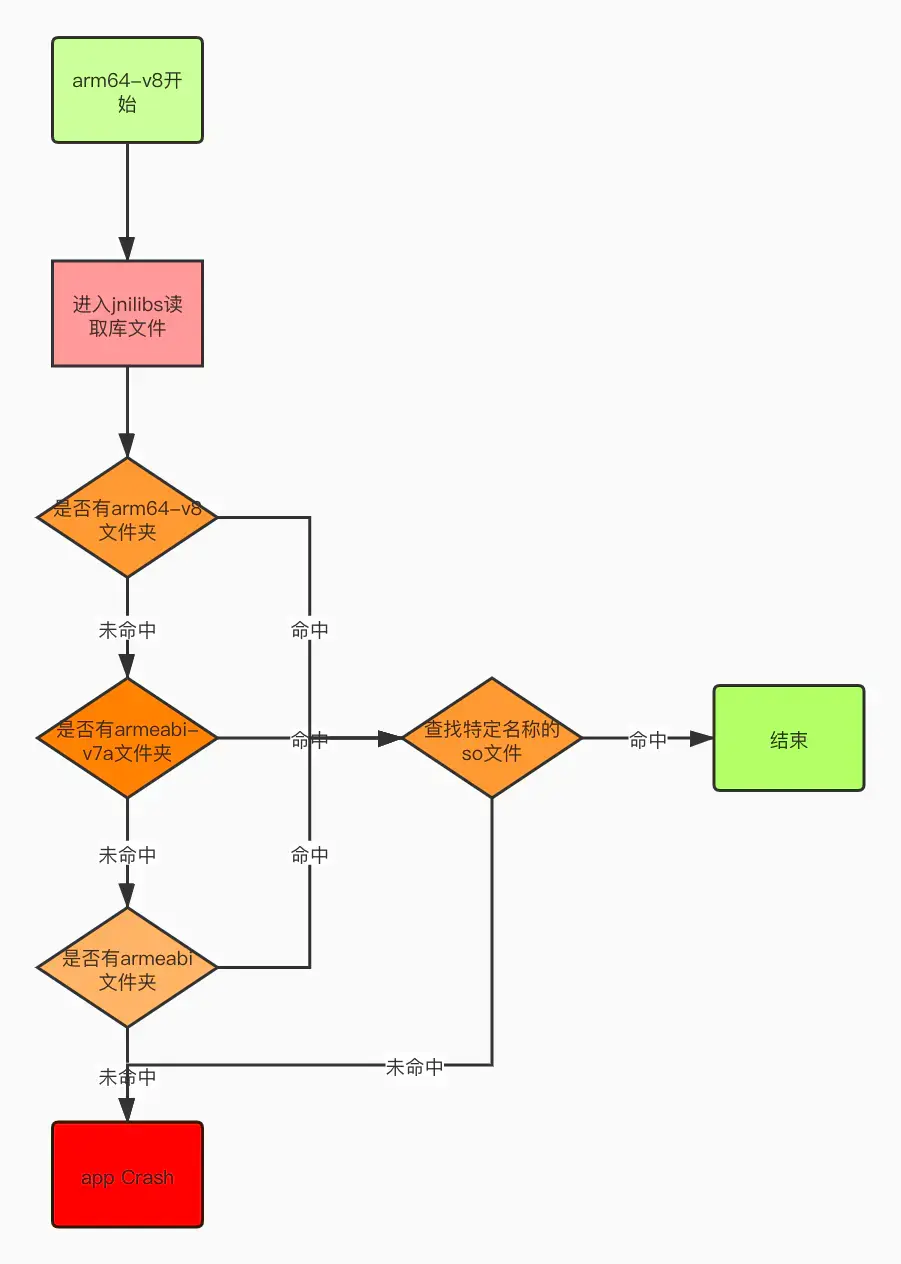 如果有arm64-v8a文件夹,那么就去找特定名称的.so文件,注意:如果没有找到想要的.so文件,不会再往下(armeabi-v7a文件夹)找了,而是直接抛出异常。