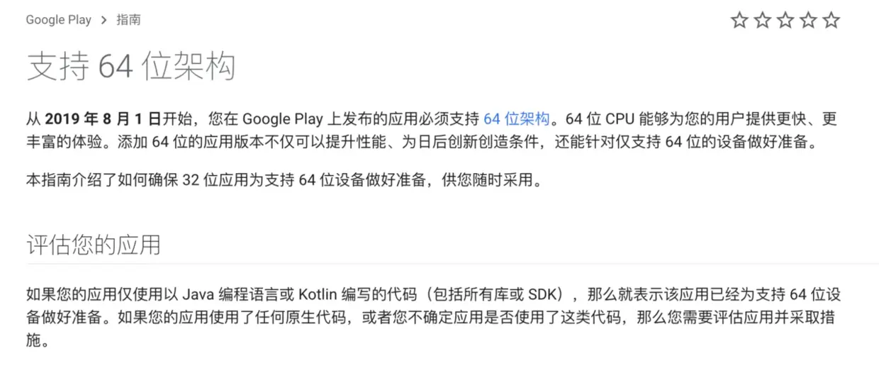 我试着在Google上查找,具体的市场占有数据,但没找到,但是从国民级应用微信只适配arm64-v8a就可以看出,arm64-v8a是目前的主流,并且还有一点,Google Play 从2019年8月开始,就强制APP适配arm64-v8a,以慢慢淘汰32位的armeabi-v7a。