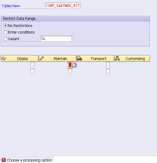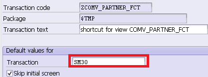 The last step is adding the new transaction code to my favorite. Unfortunately when I test it, it fails to work and raised the following error message. The initial screen still remains without any automatic navigation to detail of view COMV_PARTNER_FCT.