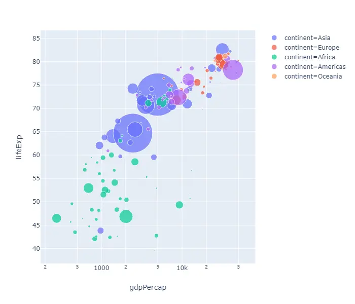 fig = px.scatter(gapminder.query("year==2007"), x="gdpPercap", y="lifeExp", size="pop", color="continent",