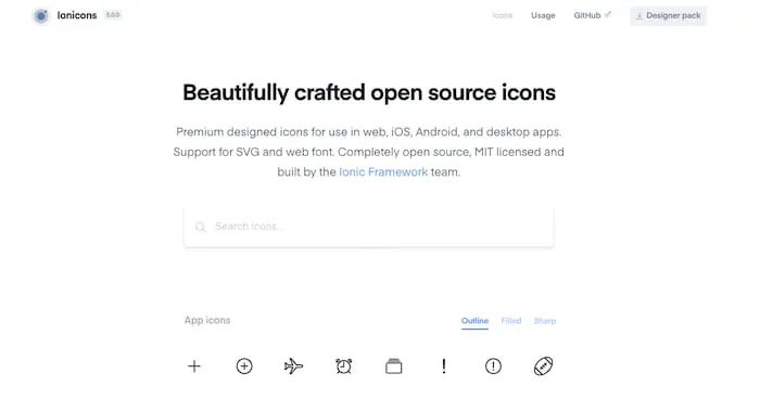 Ionicons.io是另一个由SVG驱动的开源图标库,具有457个独立图标,具有三种不同样式:轮廓、填充和锐利。我特别喜欢轮廓和形状设计的简洁明快。我绝对建议你为下一个项目尝试一下。