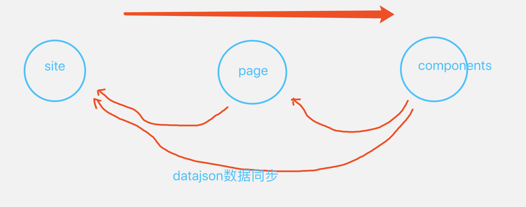 2、数据监听以及响应,项目中站点、页面以及组件三个概念的数据需要相互牵制并保持同步,网站数据填充是从顶层向下浸润,网站数据变动是从底层像顶层发布更新。数据流变动如下图所示: