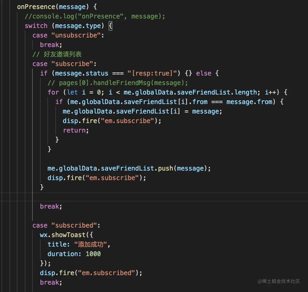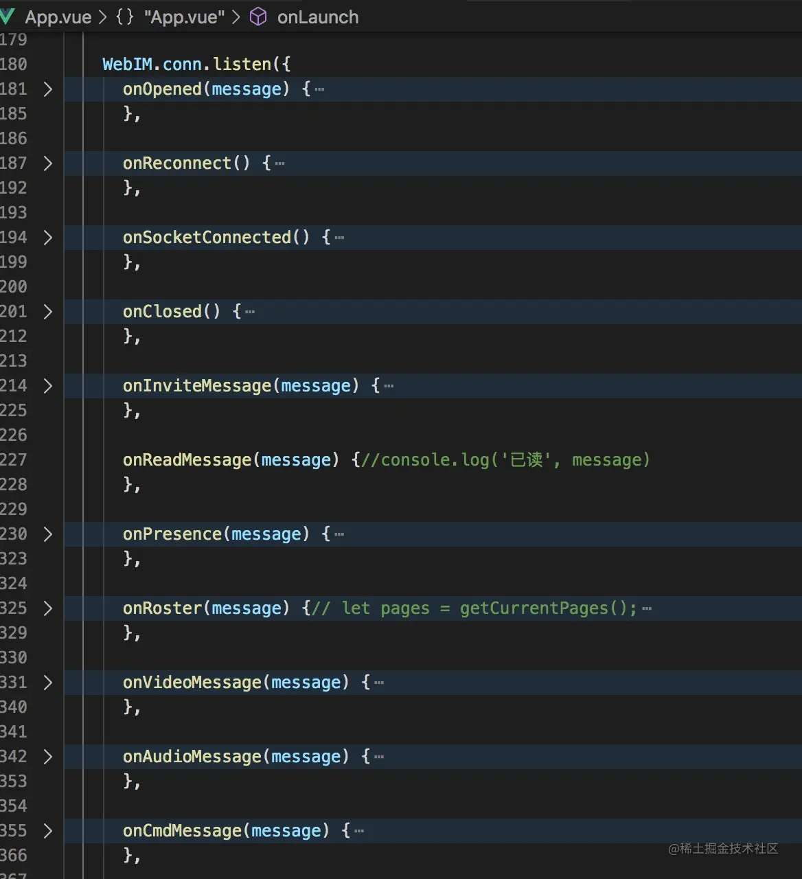 1、在全局 App.vue 文件 钩子函数 onLaunch() 中监听各种事件 (好友申请、收到各类消息等)如图:
