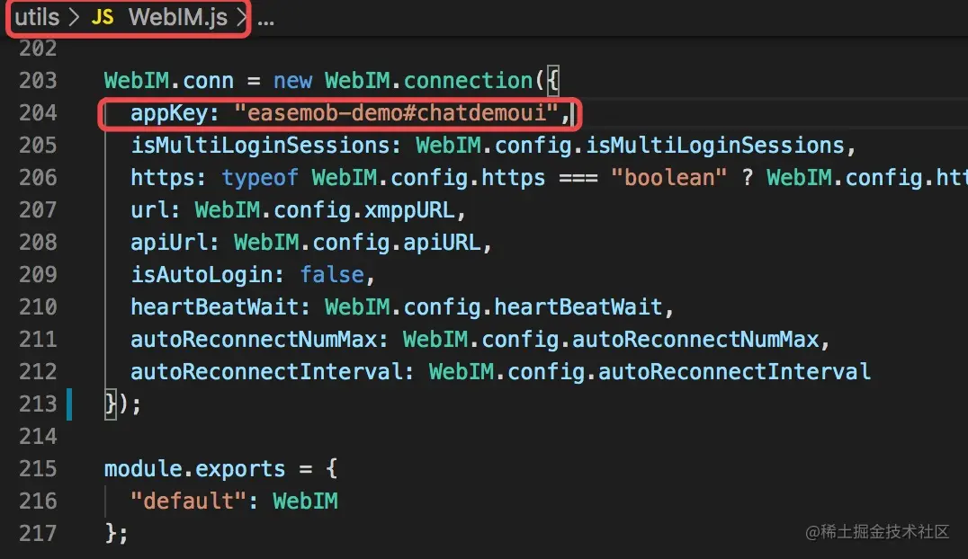 2、如何使用环信的appkey ,可以在环信 console 后台注册一个 账号申请appkey ,可以参考这里 ,获取到 appkey 以后添加到配置文件中 ,如下图所示: