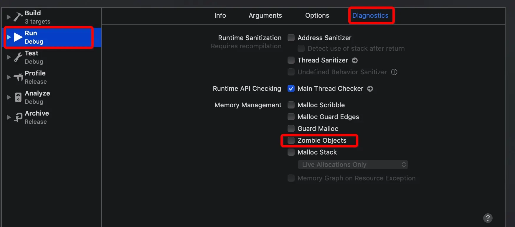 要想设置 NSZombieEnabled 环境变量,需要进入 Product → Scheme → Edit Scheme。选择 左侧的 Run,然后在右侧选取 Diagnostics 标签页。选中 Zombie Objects 选项,如下图: