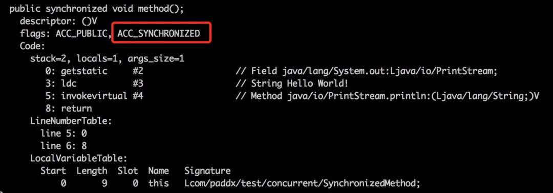 从反编译的结果来看,方法的同步并没有通过指令 Monitorenter 和 Monitorexit 来完成(理论上其实也可以通过这两条指令来实现)。不过相对于普通方法,其常量池中多了 ACC_SYNCHRONIZED 标示符。