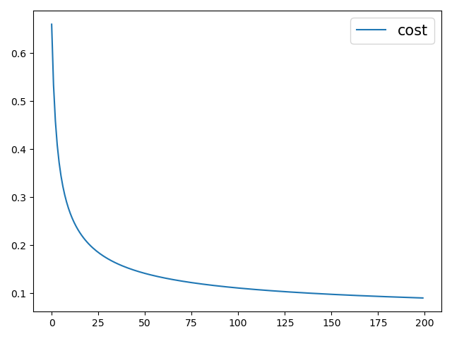 def train(X, y, ite=200): m, n = X.shape # 506,13 # W = np.random.randn(n, 1) W = np.random.uniform(-0.1, 0.1, n).reshape(n, 1) b = 0.1 alpha = 0.08 costs = [] for i in range(ite): J = cost_function(X, y, W, b) costs.append(J) W, b = gradient_descent(X, y, W, b, alpha) y_pre = prediction(X, W, b) print(classification_report(y, y_pre)) print('Accuracy: ', accuracy(y, y_pre)) return costs #结果 precision recall f1-score support 0 0.99 0.97 0.98 212 1 0.98 0.99 0.99 357 accuracy 0.98 569 -